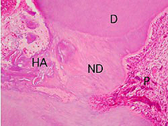 - 良質で厚い象牙質橋(dentinbridge)(ND)が誘導されている(3週後)D:象牙質、P:歯髄、HA:移植材