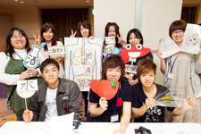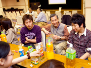 21時、学生たちの作業スペースから離れた場所に、長テーブルが並べられました。大会議室をクローズする23時までの2時間は、再びアイスブレーキング・懇親会の時間です。用意がととのったところで、“ワークショップ終了”のゴング!と思いきや、ソフトドリンクでの乾杯と少しばかりのおしゃべりの後、それぞれグループのテーブルに戻り、残っている準備作業やリハーサルを再開する学生多数。「あと2回はリハやらなきゃ!」「今さらだけど、一つ付け加えようよ」。先生たちもたくさんの学生とのなごやかな対話の時間を楽しみにしていたのですが、ちょっぴり感じたさみしさも学生の張り切りを前には封印です。