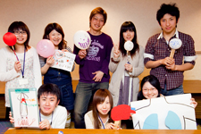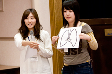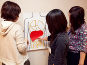 ブレーンストーミングは頭の準備体操のほかにもう一つ利点がありました。各グループ内で、自然発生的にリーダー役が決まったのです。そして、具体的な発表テーマの検討が始まりました。前回の授業で各グループに割り当てられた領域はA「肝臓」、B「脳」、C「肺」、D「心臓」、E「胃腸」。これに基づいて自分で作ってきた企画書や、教科書、資料、さらに小道具用の折り紙や色画用紙などが次々と学生のバッグから出てきます。そのダンドリのよさから合宿にかける意欲がうかがえます。ランチタイムに入る前には、各グループから、小学生の興味を引こうと知恵を絞った仮テーマが発表されました。