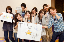 「みなさーん、息してますかー?イェーイ!」で始まったグループ名『THE☆肺』の発表。なぜ呼吸するのかの説明が進む間、メンバーの一人がほぼ実物大の肺のイラストを胸にあてて、肺の位置、形を示しています。肺で酸素と二酸化炭素が交換される仕組み、同じ口から入るのに空気は肺に入るけどなぜ食べ物は肺に入らないのか、入りそうになったらどうなるかなどは、スクリーンに映したOHPシートを活用。そして、呼吸体験が始まりました。参加者全員に立ってもらい、胸式呼吸、腹式呼吸を体験してもらいます。今日、初めての体験型です。ショパンのノクターンに乗せて、胸式は胸と肩を上下させるように、腹式はおなかと背中に手をあてて、ふだんは意識などしたことのない呼吸に会場中が集中しました。最後は、肺活量に触れ、女性は3000ml、男性は4000mlが平均で、スポーツ選手の場合は6000mlであることを、イメージしやすいよう空のペットボトルを使って説明。「お年よりは3000mlより少なくなるんだけど、実は若者でもスポーツ選手の3分の1って人がいるんだよ。そう、タバコを吸う人。よい子のみんなは吸っちゃだめだよ」と小学生へのメッセージで締めました。