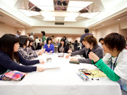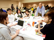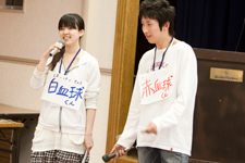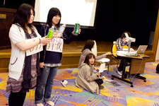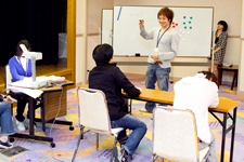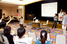 朝8時、この合宿最後のワークショップが始まる1時間前、大会議室のオープンを待っていたように学生が集合し始めました。あちらこちらで各グループが最後のリハーサル、小道具、資料の点検を行っています。そして9時。合宿の集大成となるミニ・メディカル・カフェの時間がやってきました。ここから先、発表するグループのメンバー以外は先生も学生もすべて小学生という設定。各グループの持ち時間は、発表15分、質疑応答10分です。