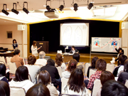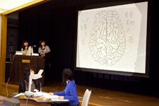 最初にスクリーンに映し出されたのは脳のイラスト。聞き手とゲスト(専門家)役がステージに上がり、右脳と左脳の役割を軽妙な会話で説明します。このOHPシートに、さらにシートを重ねて、言語処理の場所、視覚の場所などが色分けで示されました。そして、小学生のマックス君とお母さんが一緒に登場。小学生の一日の再現が始まりました。寝坊したマックス君、急いで学校へ行こうとすると、効果音が鳴り、劇はここで一時停止。聞き手とゲストの「先生、朝ご飯抜きですが」「これはダメですねぇ」というやりとりがあり、「脳に必要な栄養は?」というクイズへつなげる流れで、再現VTRを使ったテレビの情報番組のようなつくりです。学校では「授業つまんないのに起きていられるわけないじゃん」と居眠りしたり、昼休みにキャッチボールしながら「久しぶりなのに体って覚えているね」と言うマックス君の行動に合わせて、聞き手がゲストから記憶のメカニズムの話を引き出します。マックス君が遅くまでゲームをしたがる夜のシーンでは、睡眠の役割、大切さに触れました。このとき聞き手が「そういえば、どうして夢って見るんでしょうね?」と会場にふると、“小学生に戻ったつもり”にも徐々になじんできた学生からは「楽しかったことを思い出すため」と、ほほえましい答えも出ました。