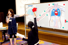 グループ名は心臓手術の一つからとった『チーム・バチスタ』。赤血球君、白血球君とハセガワ君による旅の中の会話と、カラフルな人体の図をリンクさせての進行です。旅が始まる前には、司会者が「みんな心臓どこにあるか知ってる?指さしてみて」「げんこつ作ってみて。これがだいたい自分の心臓の大きさです」など基本知識を確認しました。赤血球君と白血球君が長谷川君を案内しながら、血液が肺で酸素を手に入れて心臓に戻り、さらに体中を巡って酸素を届けるという旅ですが、旅の進行と同時に、いま赤血球君や白血球君は体のどこにいることになっているのか、その位置がホワイトボードに張った人体の図で示されます。さらにOHPでは何をしているかを拡大して示すという、わかりやすい工夫がされています。体内をぐるりと回った後は、「イカは素早く動かなきゃならないから、心臓は3つもあるんだぞー」というトリビアも提供されました。