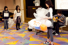 最後の発表は、グループ名『E腸』、有名なアニメのキャラクターを登場させた劇仕立てです。小さくなった主人公がカプセルに入れられて、カレーと一緒に体内に入るという設定。胃の中で胃液やペプシンに出会った主人公が「何やってるの?」と聞くと、効果音と共に博士役が出てきて「それでは説明しましょう!」。そして、博士の説明に続いてすぐに司会者がクイズを出します。「胃液の量は1日どれくらいでしょう?A:2リットル、B:5リットル、C:8リットル。さぁ、シンキングタイムスタート!」(ドラムの効果音)「はい、正解はA。これくらいです」とペットボトルを示すといったように、テンポよく、参加者の注意をそらさない構成です。会場内の照明もタイミングよく切り替え、この流れをキープしたまま、胃から十二指腸、そして小腸、大腸へ。それぞれ「膵液です」「胆汁です」などが登場し、透明のポリ袋に入った、風船をばらばらにしていくことで消化を表現しました。その後、主人公が「暗くて、なんだかつっかえてるみたい」と便秘にも触れ、「わぁー、動き出したー」(トイレで水を流す効果音)。「いままで少しはずかしかったけど、うんち出るのって自然なことなんだね」と、学校で便意があってもがまんしてしまい便秘になる小学生が多いといういまの問題を意識したラストでした。