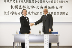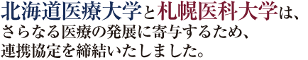 札幌医科大学と北海道医療大学は、医療系大学としての教育・研究・医療実践の実績を基盤に、保健と医療と福祉を統合的に捉えることのできる新たな時代に対応する質の高い医療人教育、医療科学分野における学術・研究の進展、社会が求める充実した医療サービス・各種情報の提供などを通じて、「地域社会に貢献する医療人の育成」を目的としてここに連携協定を締結する。【提携の内容】