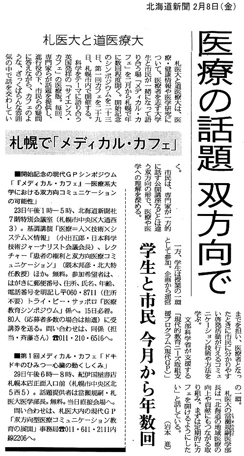 これは科学をテーマに語り合う英国発祥の「サイエンス・カフェ」の医療版ともいえるもので、本学と札幌医科大学それぞれが持つ教育・研究資源を活用しながら、カフェのような気軽な雰囲気の中で双方向の形で市民と話を交わし、医療や医学への理解を深めてもらうものです。