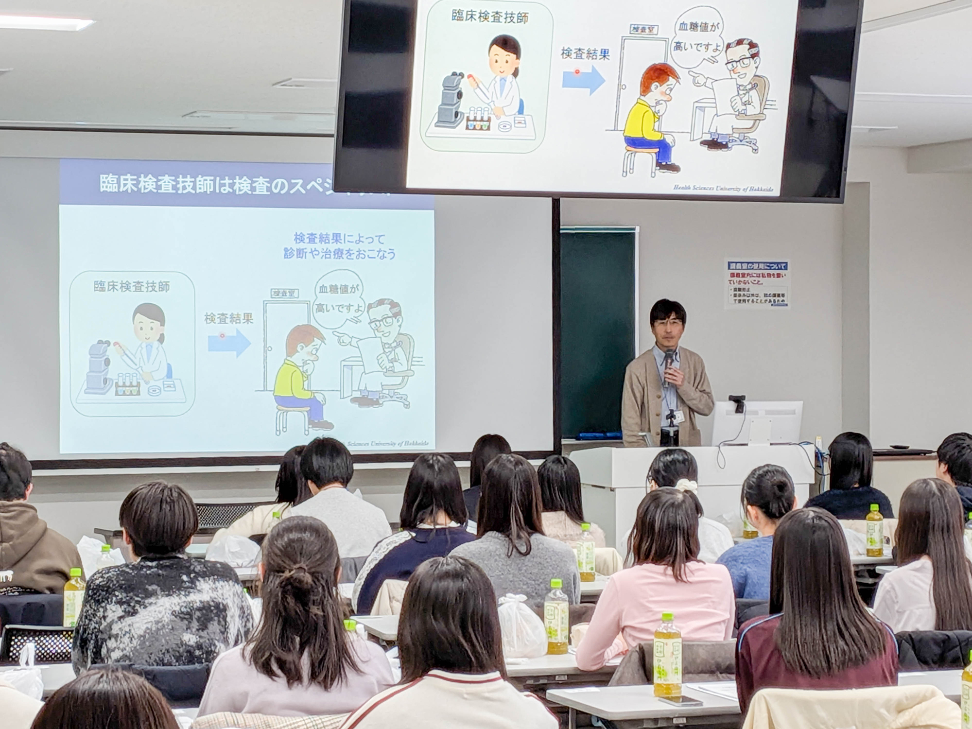 吉田教務部長より、臨床検査技師になるための心構えや、大学での講義・試験等について説明を行いました。