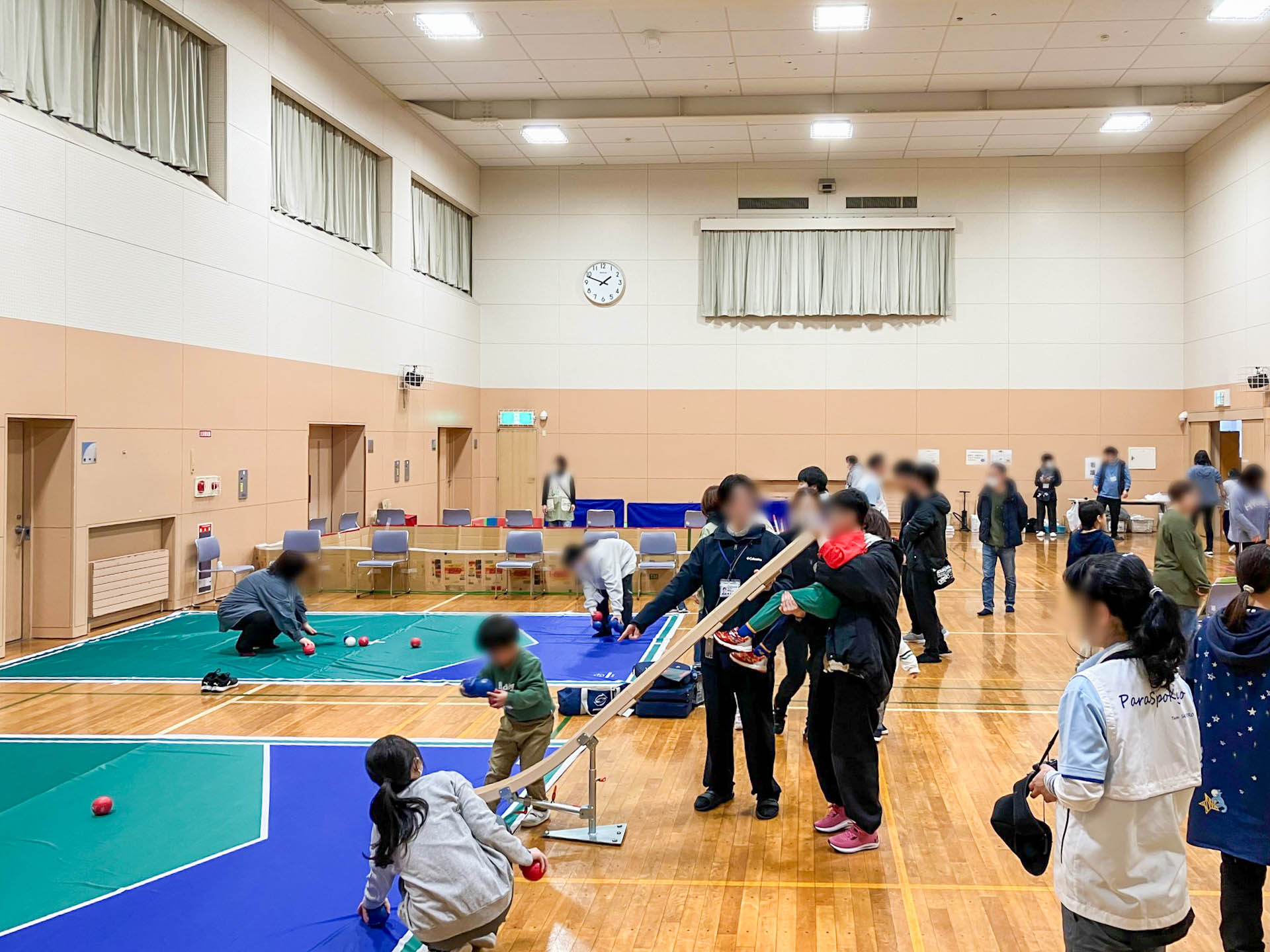 札幌市拓北・あいの里地区センターとむぅを会場として、ボッチャ、フロアカーリング、モルック、フライングディスク、シットスキー、風船バレー、ペガーボールなど多様な種目が実施されました。当日はあいにくの天候で、外で実施をしていたシットスキー、モルックへの影響がありましたが、60名ほどの子どもたちが集まり、からだを動かして楽しみました。