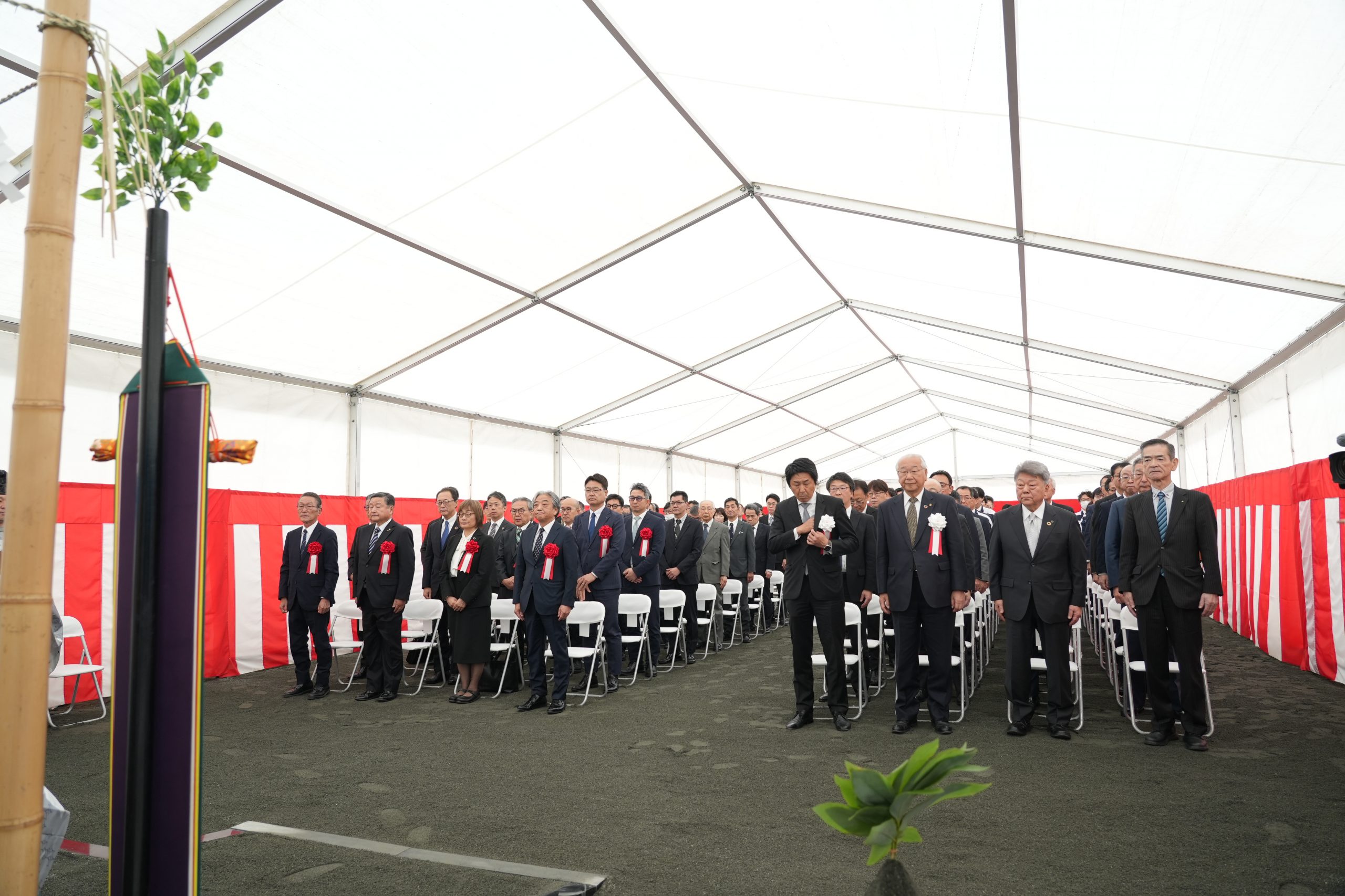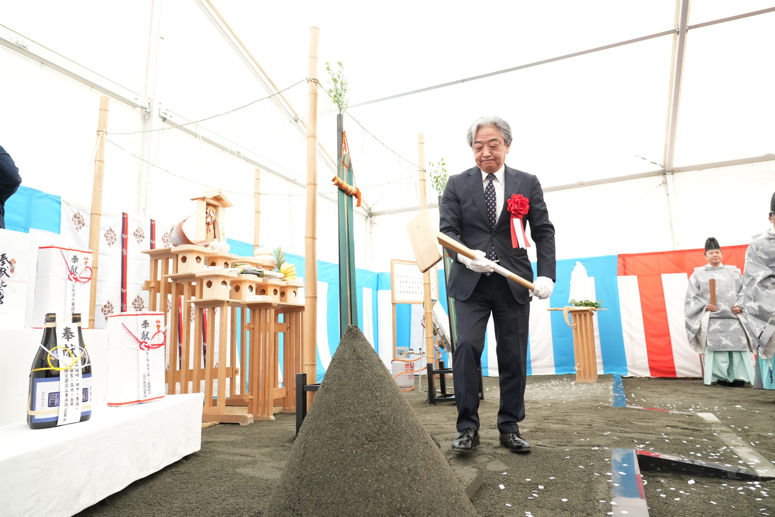 式典では、祝詞奏上、清祓の儀、地鎮行事などが執り行われ、工事の安全と新キャンパス整備の成功を祈願しました。