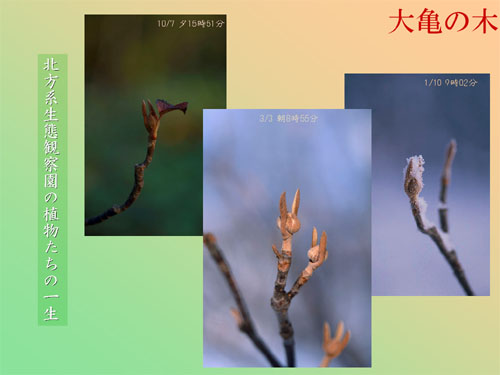 下の写真はオオカメノキの冬芽を10, 1, 3月の3回にわたって撮影したものですが、いかがですか?ずーっと同じ姿で春が来るのを待ってるんです。よーっく見ると、ウサギさんみたいに見えませんか?