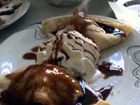 疲れを癒すために(何の?),今度は,向かいの建物の2階にある喫茶店(CAFE,MILENA[26])に入りました.コーヒー[27]とクレープ[28]を注文.歯が痛くなるほど甘くておいしい(注:甘党).窓からは例の時計も見えます.ちょうど,クレープを食べているときに12時になり,また,使徒の人がくりっ,くりっ,と愛想をばら撒いています,ばらばらばらっ,そして,雄たけび,そして,絶妙なリアクション.ああぁ,プラハにいるって感じです.