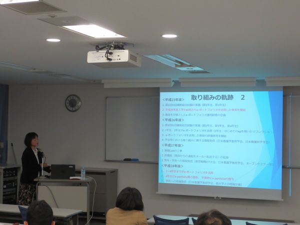 本研修会は、第11回日本eラーニング大賞eポートフォリオ部門賞を受賞された東京慈恵会医科大学医学部看護学科から、学習評価システム委員会委員長の梶井文子先生にお越し頂きました。学生のビジョン・ゴールに基づく主体的な学びを強化するために、ディプロマポリシーに基づいた省察や成果物の管理等の機能を備え、学生の成長を可視化しフィードバックできるeポートフォリオシステムについて、概要及びシステム導入にあたっての教員の体制づくりなどについてご講演頂きました。またご講演の中では、学生が使用しているeポートフォリオをWeb 上から実際に閲覧させて頂き、学生がどのように活用しているか、また教員とどのように共有し教育に活かしているのかを具体的に知ることが出来ました。