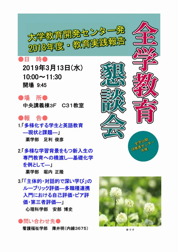 大学教育開発センターによる2018年度教育実践報告「全学教育懇談会」のご案内 (2019年3月13日(水)開催)