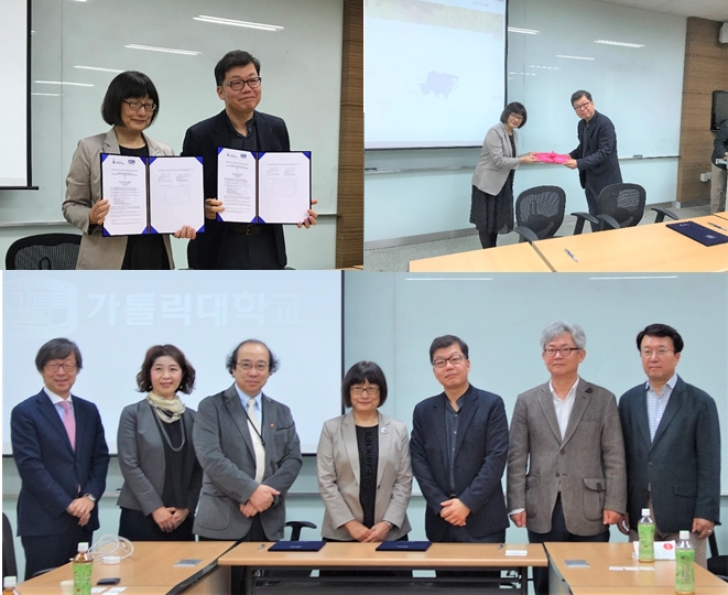 調印式は韓国カトリック大学の聖心キャンパスで行われ、カトリック大学側からは社会福祉学科のChan-Woo Kim学科長が、本学からは三国久美学部長(看護福祉学部)がそれぞれ、協定書に署名しました。